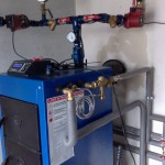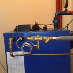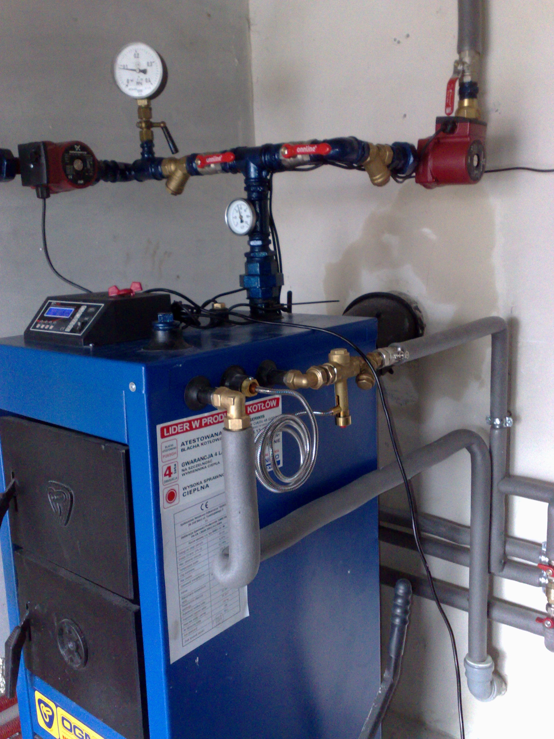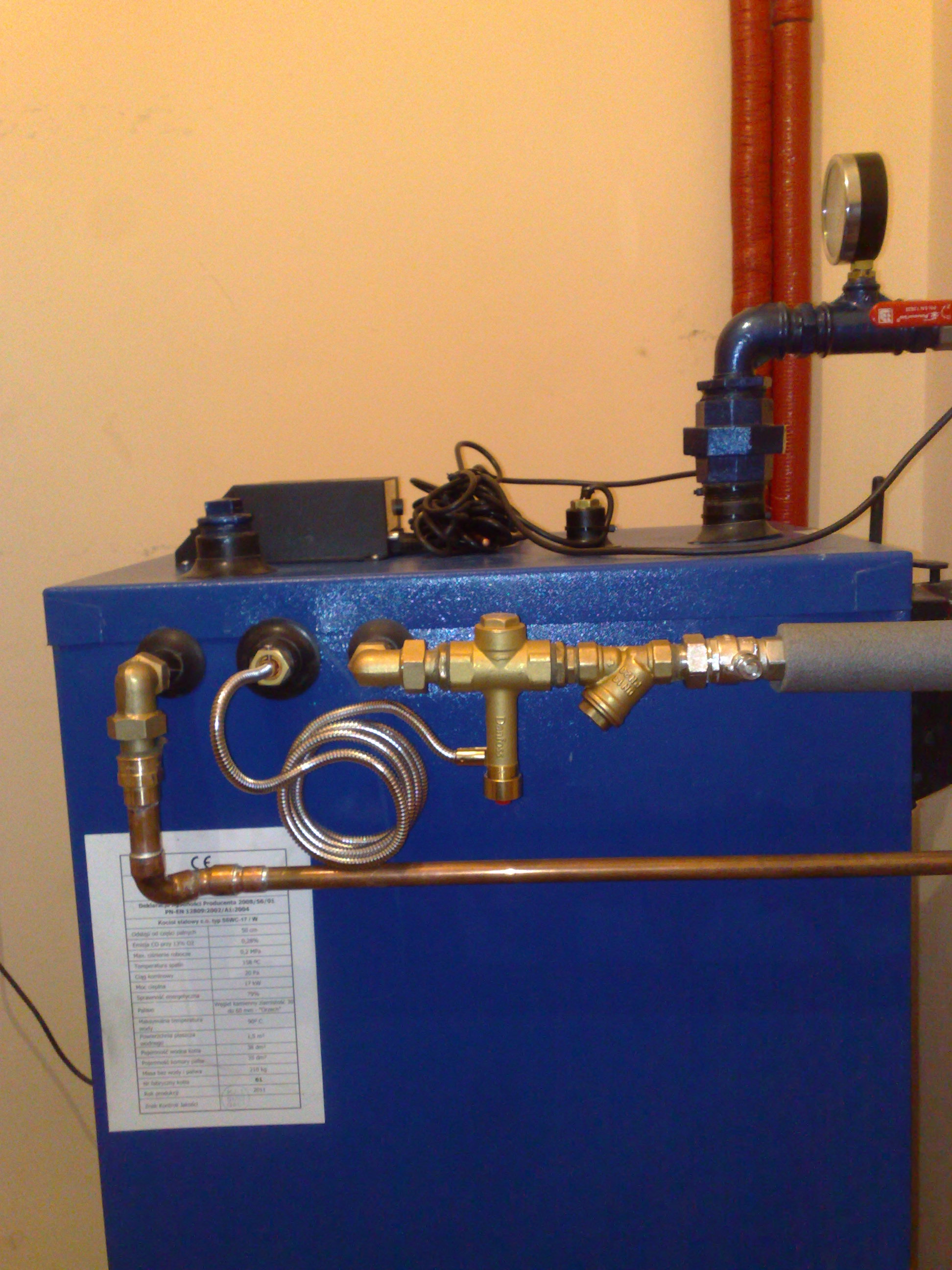 Kocioł na paliwo stałe z wężownicą bezpieczeństwa. Kocioł na paliwo stałe z wbudowaną wężownicą bezpieczeństwa i podłączonym zaworem termostatycznym celem odprowadzenia nadmiaru ciepła.
