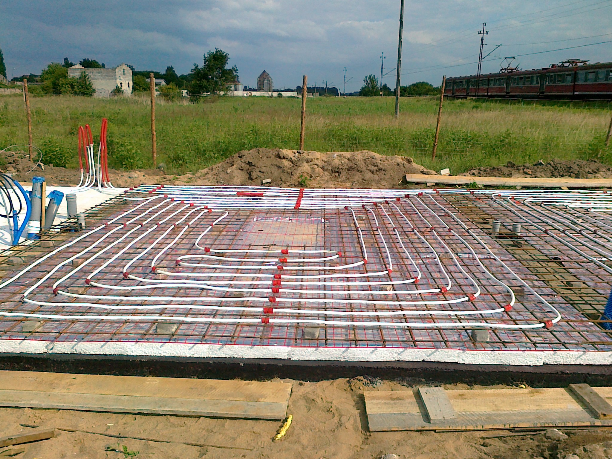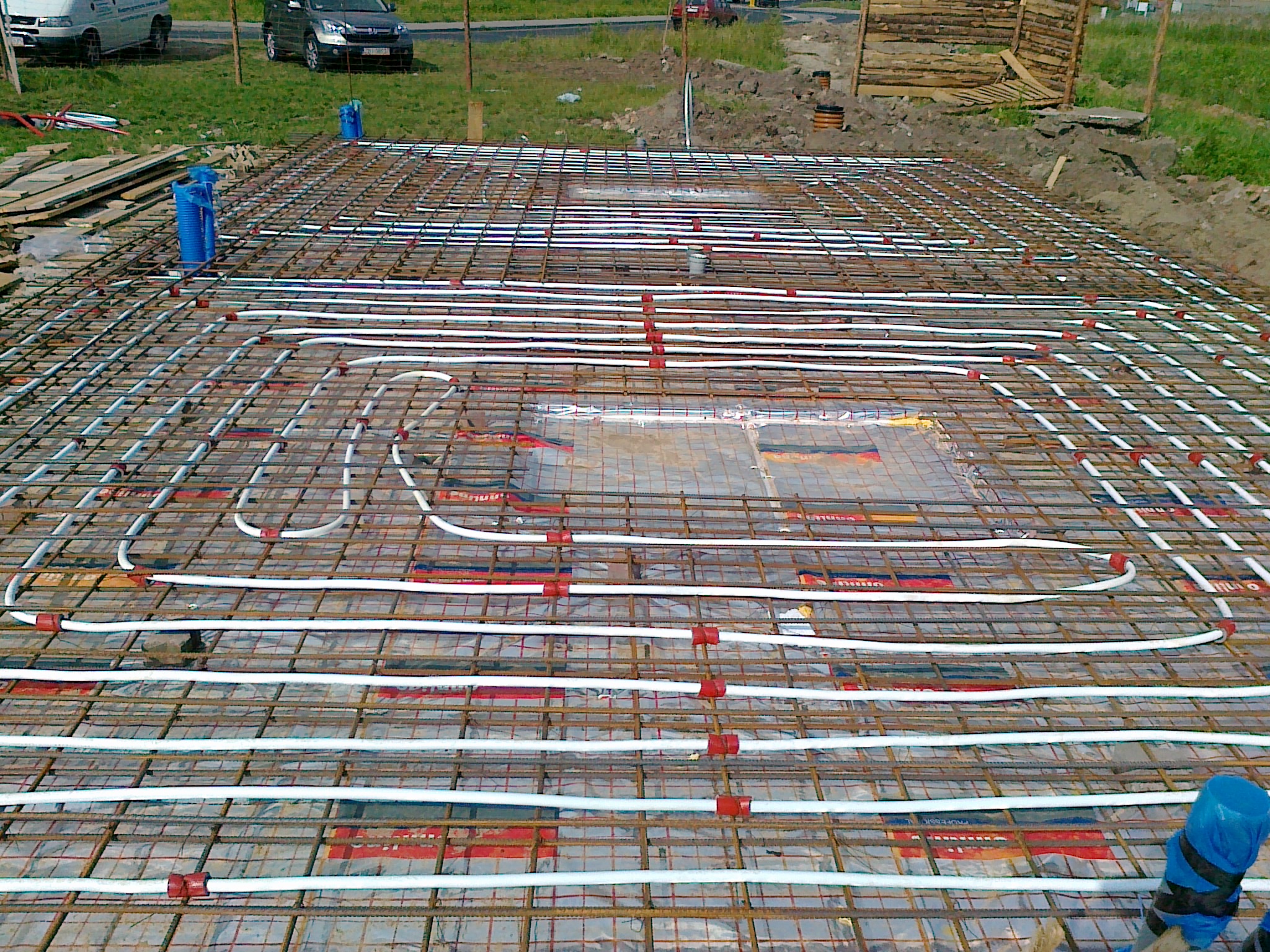 Ogrzewanie myjni samochodowej Ogrzewanie płyt najazdowych w myjni samochodowej wykonane na zbrojeniu płyty nośnej.W zimie instalacja podgrzewa posadzkę z boksami przeznaczonymi do mycia samochodów.